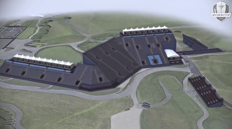 The impressive opening hole and closing hole grandstand complex at Le National for the Ryder Cup (Photo – www.europeantour)