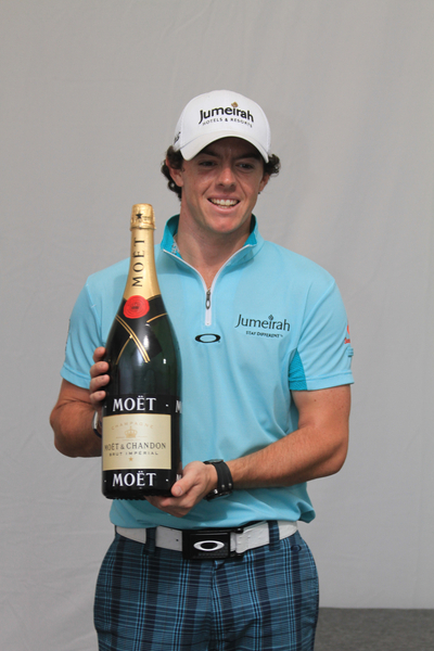 Rory McIlroy gets his hands around the most photographed bottle of empty bubbly after his opening round in the 2011 Dubai World Championship. (Photo - Fran Caffrey/www.golffile.ie)