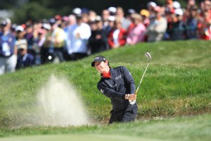 - Rory McIlroy splashes out of a bunker at the 7th hole on route to a shock 77. (Photo – Eoin Clarke/www.golffile.ie)