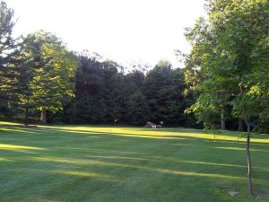 Looking into 4th green with fallen tree in background.