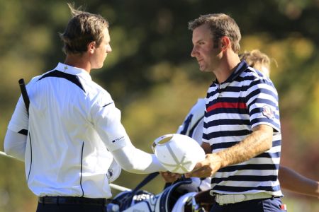 American Dustin Johnson shakes hands with Belgium’s Nicolas Colsaerts after winning his Singles match. (Photo – Fran Caffrey/www.golffile.ie)