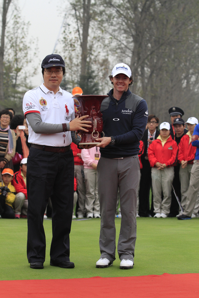 Rory McIlroy handed the special Chinese ornate vase after defeating Tiger Woods in the ‘Duel at Jinsha Lake’. (Photo – www.golffile.ie)