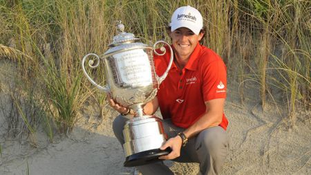 Rory McIlroy with Wanamaker Trophy (red)