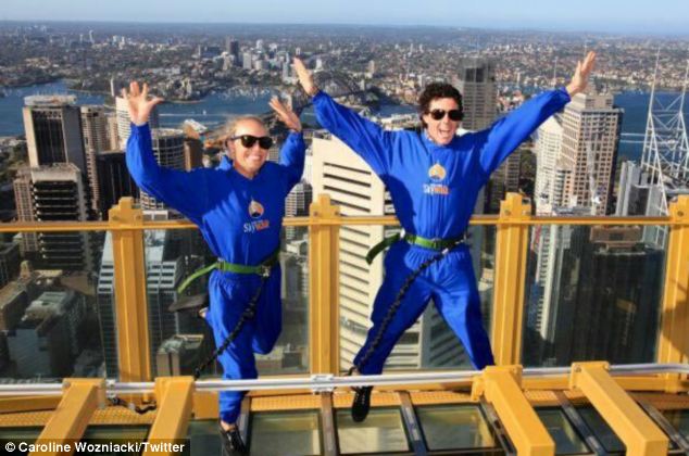 The duo donned special suits to undertake a sky walk around the 309 metre or 1,014 feet high structure located right in the heart of the Sydney CBD.