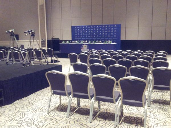 An empty press conference – at least someone believes a decision will be forthcoming tonight in Abu Dhabi. (Photo – www.golfbytourmiss.com)