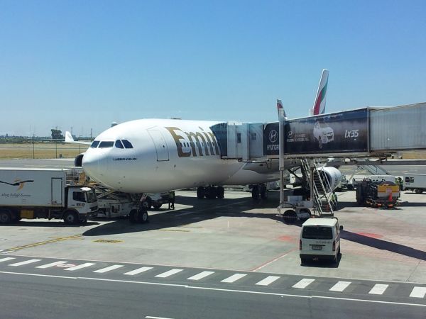 Emirates flight at gate in Cape Town