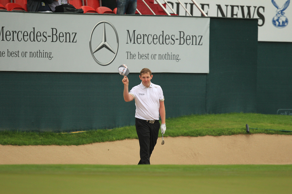 Scotland’s Stephen Gallacher acknowledges the crowd after holing a bunker shot at 18 to upstage Tiger Woods and secure a new 54-hole low in the 2013 Omega Dubai Desert Classic. (Photo – Stuart Adams/www.golftourimages.com)