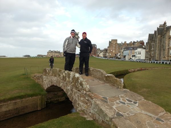 Kingsbarns Alan Hogg, Bernie and Koala colleague on Swilcan Bridge