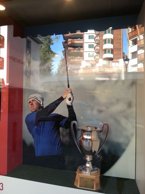The trophy and a photo of Richie Ramsay sitting the display winner of Barras Agency in Crans Montana. (Photo – www.golfbytourmiss.com)