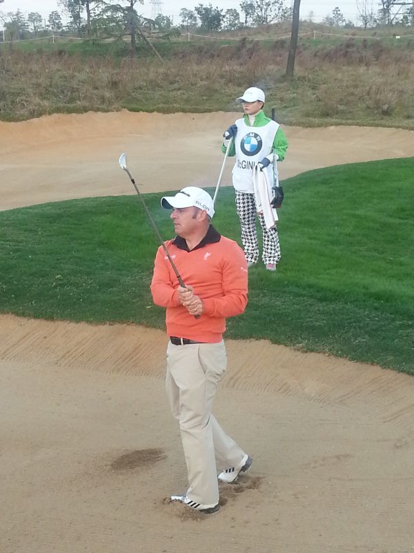 Paul McGinley plays a bunker shot into 15 as his Chinese caddy looks on. (Photo – www.golfbytpurmiss.com)