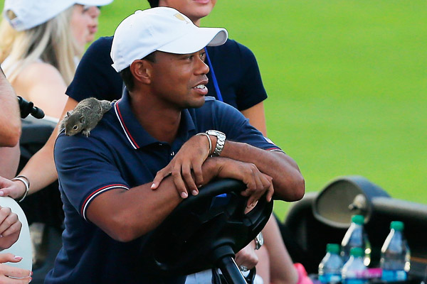 ‘Sammy’ the squirrel stole the show on the opening day of the Presidents Cup including finding a place to rest on the shoulder of 14-time Major winning Tiger Woods.