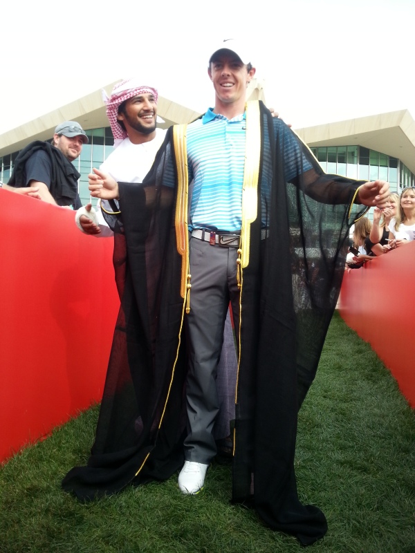 The double Major winner recorded a superb two under par 70 and after a series of post-round interviews he was met by Adil Khalid who was dressed in typical Arabian attire.