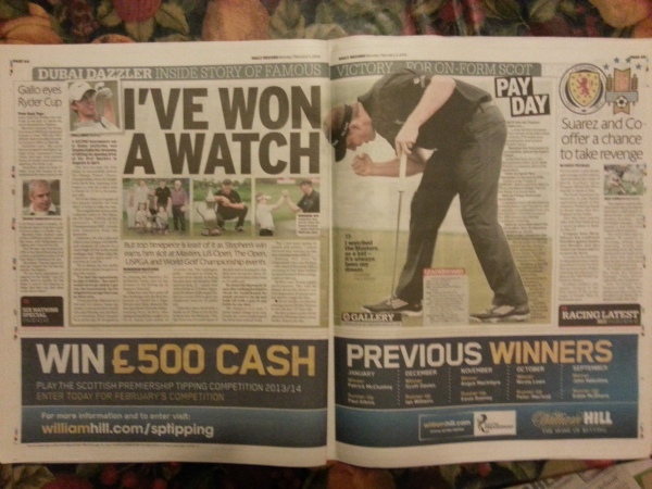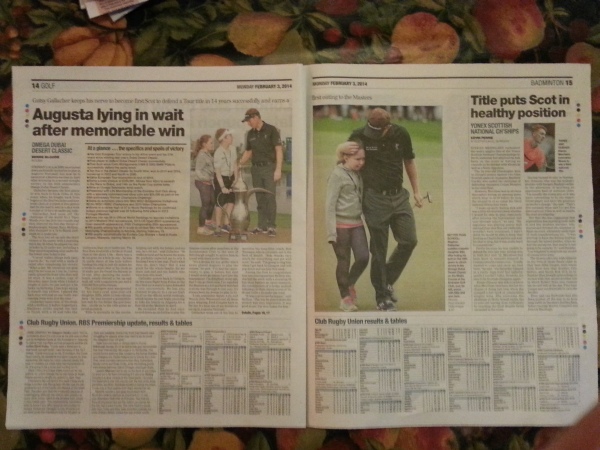 And The Herald commissioned two pages for Bernie’s coverage of Gallacher retaining the Dubai Desert Classic trophy.