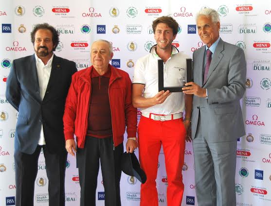 Edouard Espana receiving the winner’s trophy from Mustapha Zine of the Royal Moroccan Golf Federation as Mohamed Juma Buamaim, Chairman of the MENA Golf Tour, and Abdulrehman Buftas, president of the Royal Golf of Dar Es Salam Club, look on. (Photo – www.MENATOUR.com)