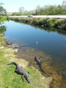 A car drives past on Highway 14 as alligators laze on bank