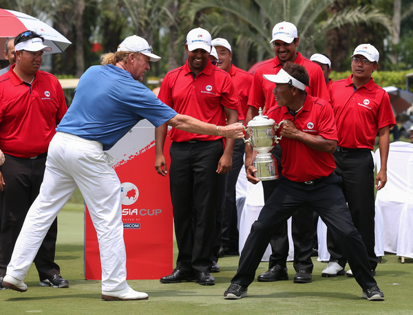 The fight is still on despite the Trophy being shared. Team Asia Captain, Thongchai Jaidee (THA) tries to pull the trophy from Team Europe Captain, Miguel Angel Jimenez (ESP) after the final day of Singles matches at the 2014 EurAsia Cup presented by DRB-Hicom, at the Glenmarie Golf & Country Club, Kuala Lumpur, Malaysia. Picture: David Lloyd / www.golffile.ie