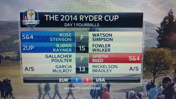 However there was despair for Mr Ryder Cup Ian Poulter when he and rookie Stephen Gallacher were thumped by the same margin and with the American rookie pair of Jordan Spieth and Patrick Reed securing the first point for the USA team with a 5 & 4 success.