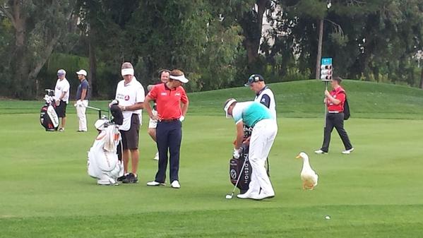 There was light-hearted moment on the ninth hole of the Montgomerie Maxx Royal course when a few ducks emerged from one of the many hazards.