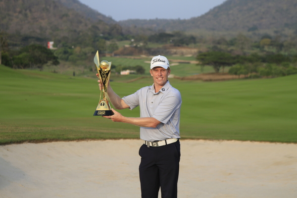 Andrew Dodt proudly holds aloft the true Thailand Classic trophy. (Photo – Thos Caffrey/www.golffile.ie)