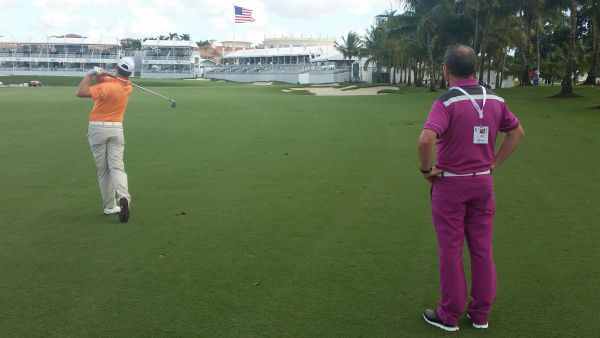 Marc Warren plays his second shot into the last under the watchful eye of the all-purple dressed Alan McCluskey during Tuesday’s practice round on Trump Doral. (Photo – www.golffile.ie)