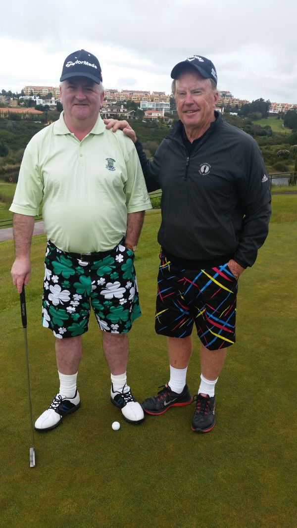 Irish-born Joe Duddy looked resplendent in an appropriate pair of Paddy Par short while Bernie McGuire, an Aussie with an Irish surname, was decked out in a pair of eye-catching Par Tee shorts.