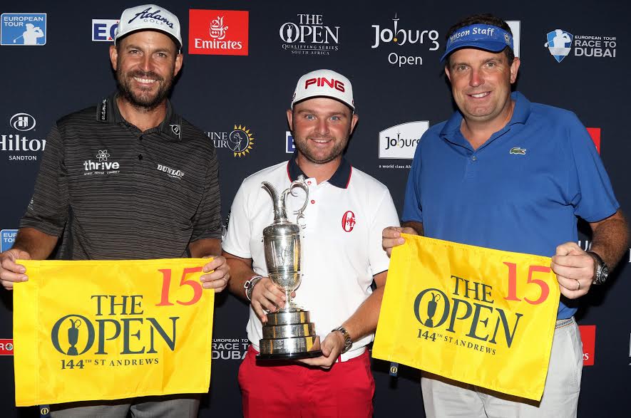 Andy Sullivan tempting fate by holding the Claret Jug and flanked by fellow England golfers David Howell and Anthony Wall who all qualified for this year’s Open Championship. (Photo – www.randa.org)