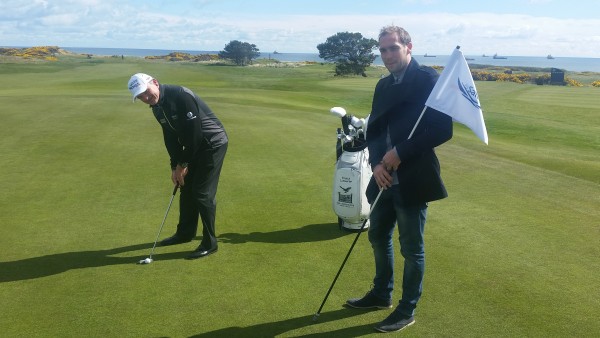 Paul Lawrie & Russell Anderson on the 18th green at Murcar Links Golf Club. (Photo – www.golfbytourmiss.com)