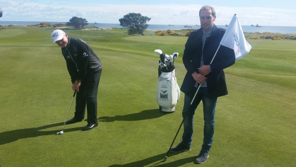 Paul Lawrie & Russell Anderson on the 18th green and at the launch of the Saltire Energy Paul Lawrie Match-Play Championship. (Photo – www.golfbytourmiss.com)