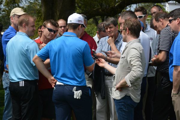 Bradley Neil speaking withe UK media after his round with World No. 1 Tiger Woods.  (Photo - www.golfbytourmiss.com)