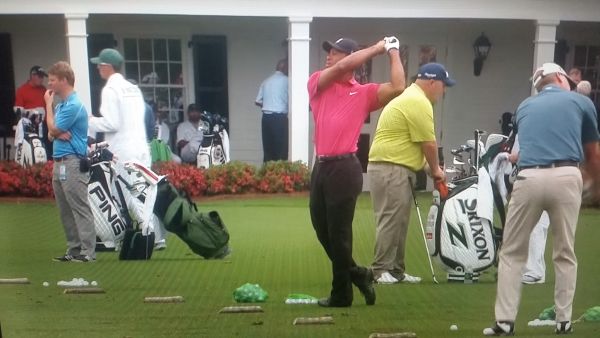 Tiger Woods wearing what looks like a red shirt during his session today on the Augusta National practice range.