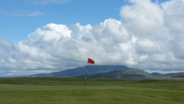 Askernish GC – View of the 1st green with South Uist mountains in the background (Photo – www.golfbytourmiss.com)