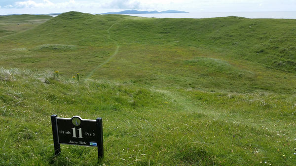 Askernish GC – View off the demaning 191-yard 11th tee with the island of Barra in the background as your line off the tee and a simple pathway through the grass leading up to the green.