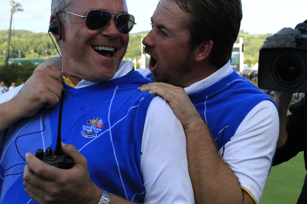 Vice Captain Darren Clarke and Graeme McDowell celebrate winning on the 18th green after the Singles Matches during the Final Day of the The 2010 Ryder Cup at the Celtic Manor, Newport, Wales, 3rd October 2010..(Picture Eoin Clarke/www.golffile.ie)