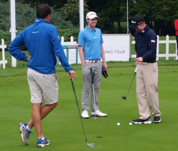 Kevin Phelan (light blue shirt) chatting with Gavin Moynihan on the practice putting green here at Monza.