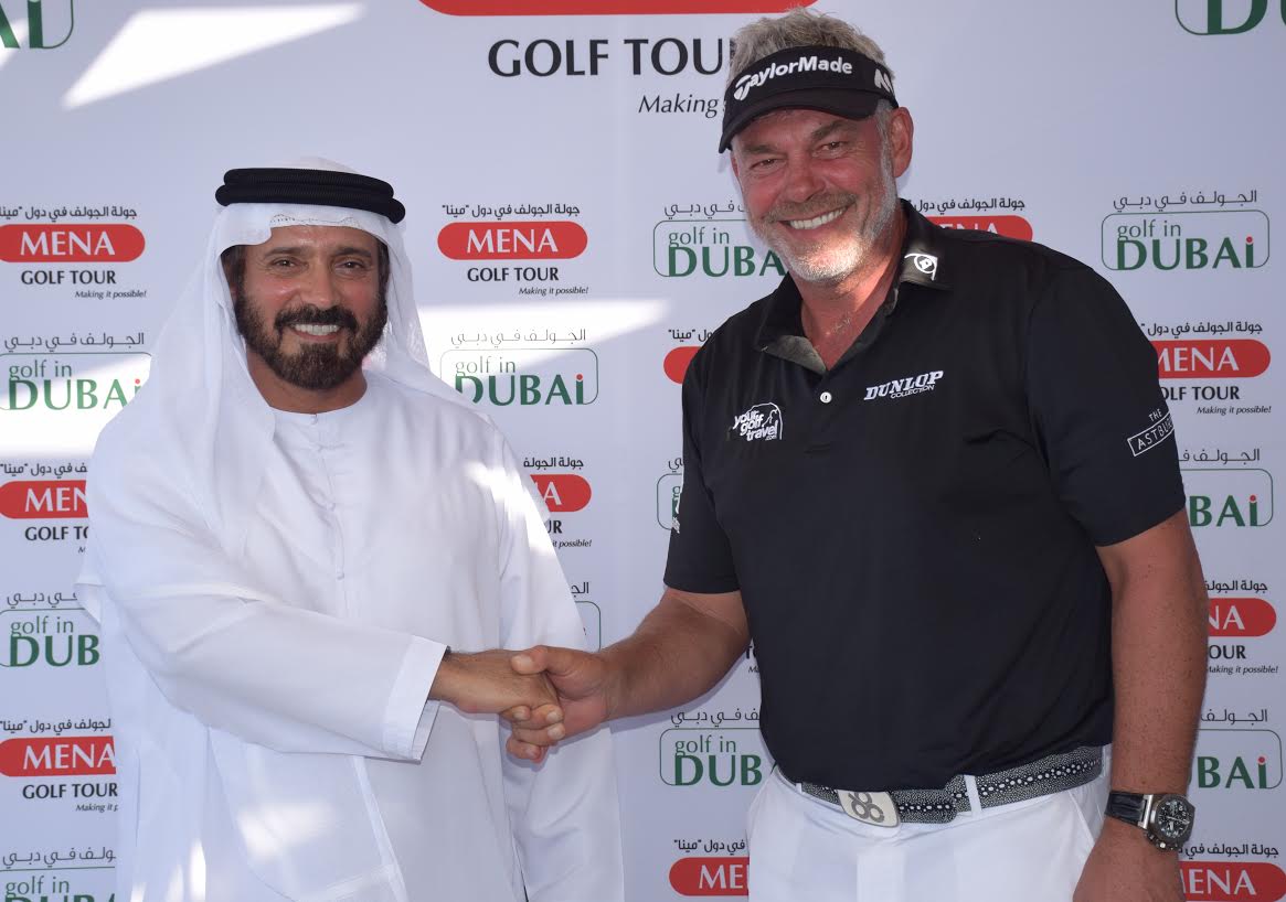 Mohamed Juma Buamaim, chairman of the MENA Golf Tour, with Darren Clarke at Tower Links Golf Club in Ras Al Khaimah on Tuesday
