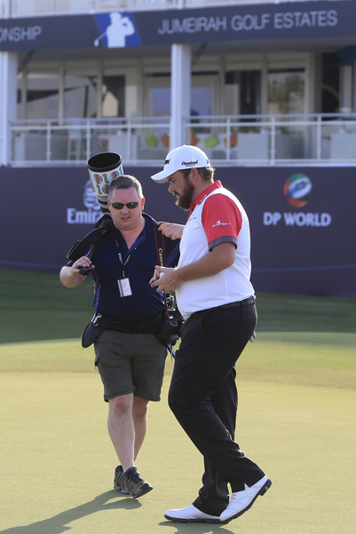 Shane Lowry (IRL) on the 18th green with Fran Caffrey (Golffile) during the preview for the DP World Tour Championship at the Earth course, Jumeirah Golf Estates in Dubai, UAE, 18/11/2015.