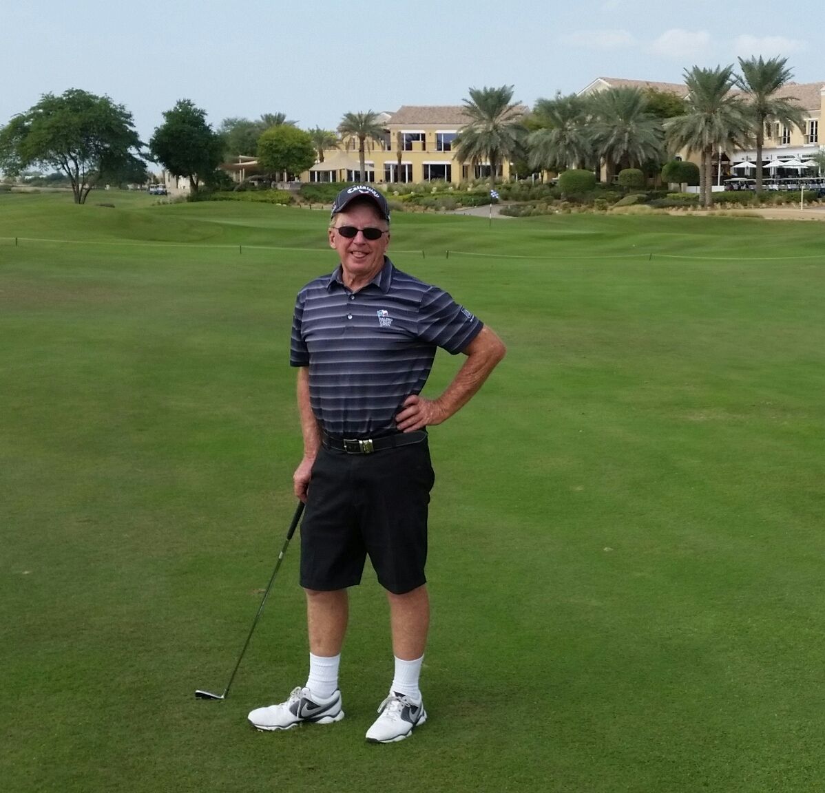 Stuart Adams and Denis Kirwan enjoying their round of golf at Arabian Ranches.