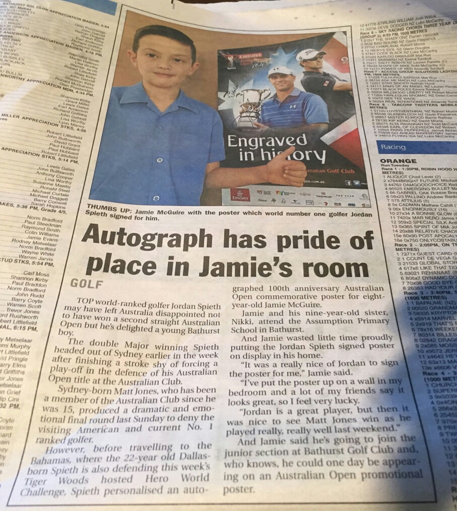 It was during the Australian Open that defending champion and World No. 1 Jordan Spieth personally autographed a commemorative poster for eight-year old Jamie.  And thanks to the local Western Advocate newspaper they ran a story on Spieth signing the poster for young Jamie.