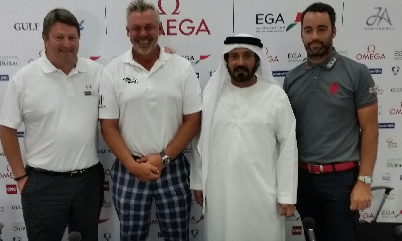 Those attending the MENA Tour announcement – Grant Wilson, CEO Sunshine Tour, Darren Clarke and patron MENA Tour, Mohamed Juma Buamaim, Chairman of the MENA Tour & MENA Tour player Zane Scotland.
