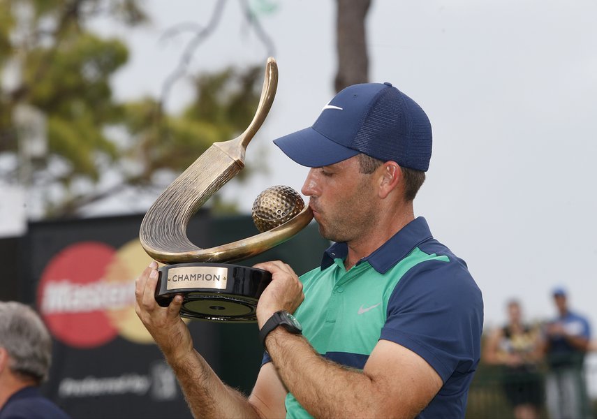 Charl Schwartzel plants a kiss on the unique Valspar Championship paint brush trophy