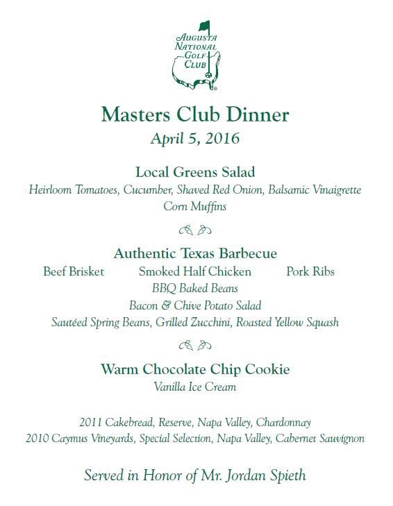 Augusta, GA .. As first reported by www.golfbytourmiss.com last November at the Australian Open and defending Masters champion Jordan Spieth went with a Texas bar-b-que as his main course at tonight’s dinner at the Augusta National clubhouse.