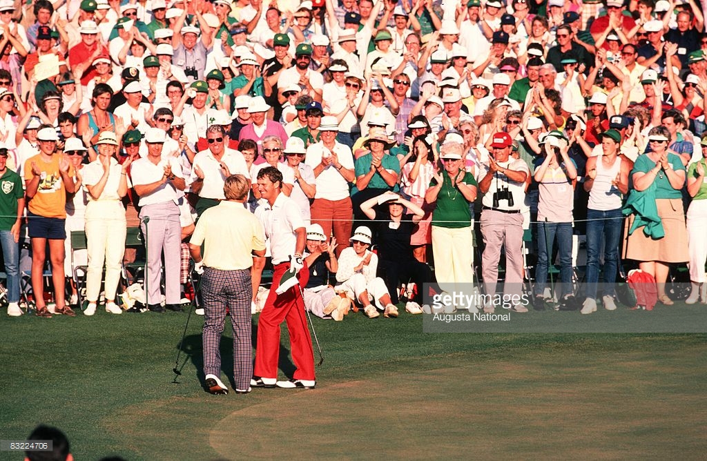 Sandy Lyle shakes hand with 1986 Masters Champion Jack Nicklaus after the ‘Golden Bear’, at age 46 made up a four shot deficit to win by one.