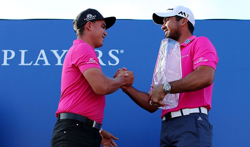 New Players Championship winner Jason Day congratulated by Rickie Fowler who had missed the cut in the defence of his title. (Photo – @pgatour)