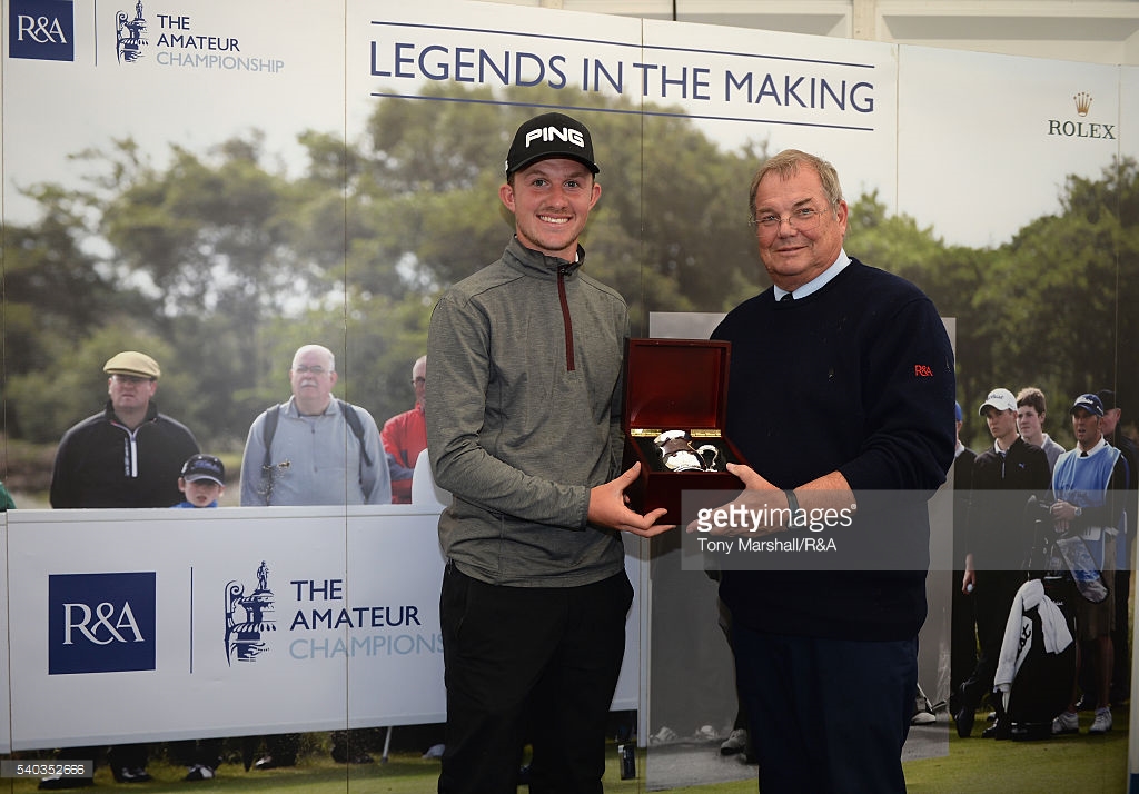 Reigning Australian Amateur champion Connor Syme being presented with his award by the R & As Peter Unsworth after finishing the top qualifier in the 2016 Amateur Championship. (Photo – RandA)
