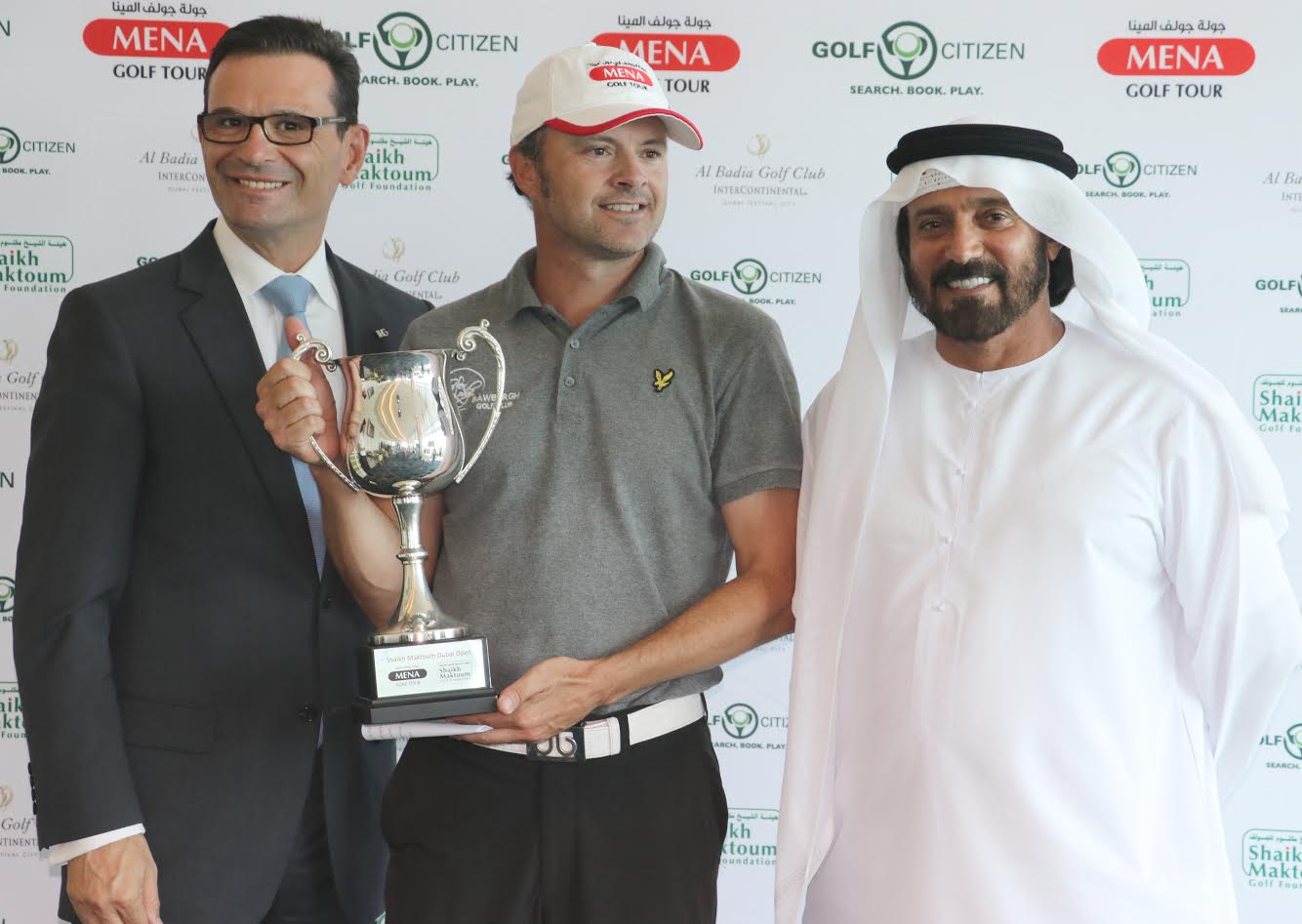 Shaikh Maktoum Dubai Open winner Andrew Marshall of England with James Koratzopoulos of Dubai Festival City and Mohamed Juma Buamaim, chairman of the MENA Golf Tour, at Al Badia Golf Club on Wednesday