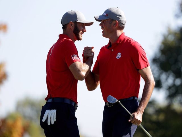Dustin Johnson and Matt Kuchar hand out the biggest defeat in the first session – 5 & 4 – to Lee Westwood and Thomas Pieters.