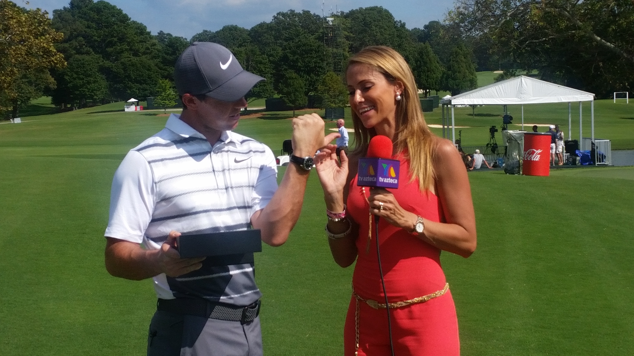 .. and McIlroy ends his practice round being handed a gift by a Mexican TV reporter ahead of next year’s WGC event in Mexico.