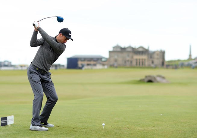 Ross Fisher driving off the final hole at St. Andrews and on route to a one stroke after two rounds. (Photo – European Tour)