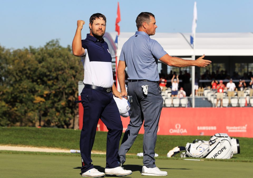 Willett’s nightmare Ryder Cup ended on the 14th green with fellow rookie Koepka storming back from 1 down after five holes and kick-start victory with an eagle at seven. Koepka then won nine, 10 and 11. The duo halved 12 with pars before Willett’s race was run losing 13 to a bogey and with Koepka closing it out 5 & 4 at the next. USA 12 ½ – Europe 9 ½