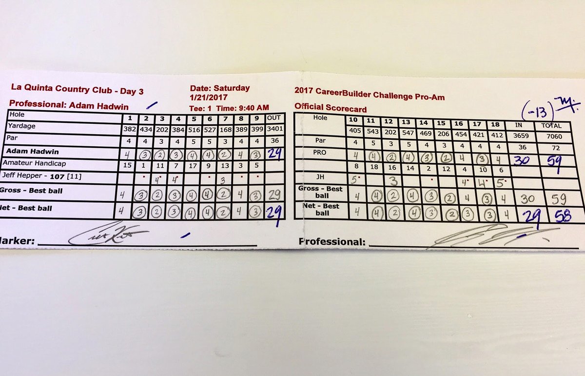 But now just nine days after Justin Thomas shot a 59 on the opening day of last week’s Sony Hawaiian Open and 26-year old Canadian Adam Hadwin managed to shoot a 59 on the third day of the Career Builder Challenger here in La Quinta, California.